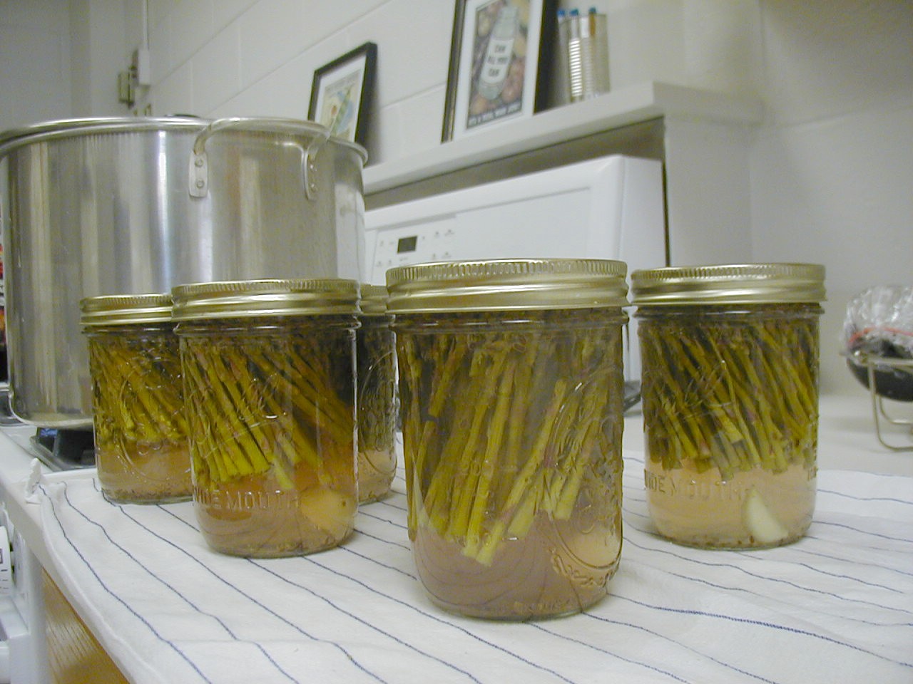 - Wash asparagus well, but gently, under running water. Cut stems from the bottom to leave spears with tips that fit into the canning jar with a little less than ½-inch headspace. Peel and wash garlic cloves. Place a garlic clove at the bottom of each jar, and tightly pack asparagus into jars with the blunt ends down.